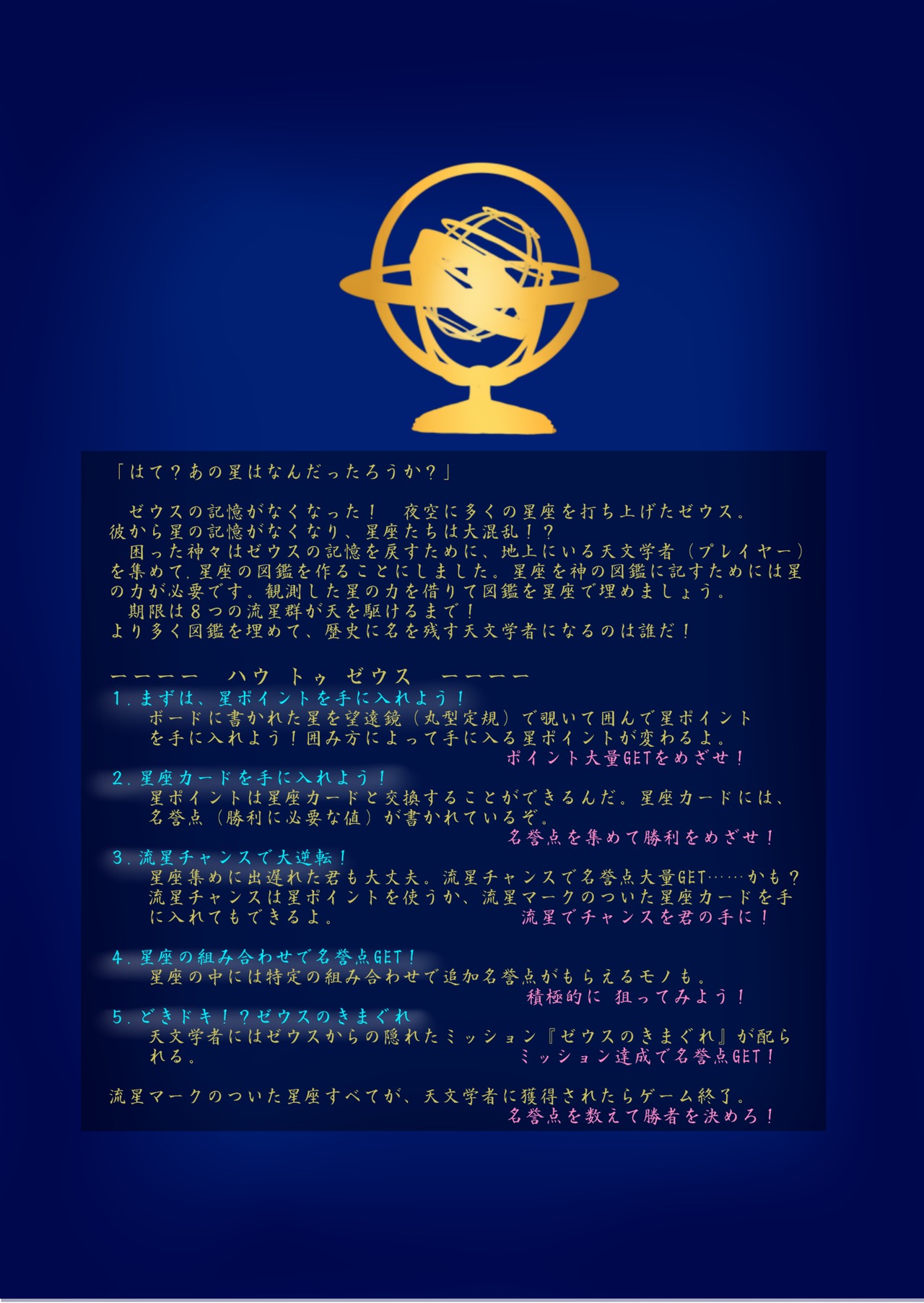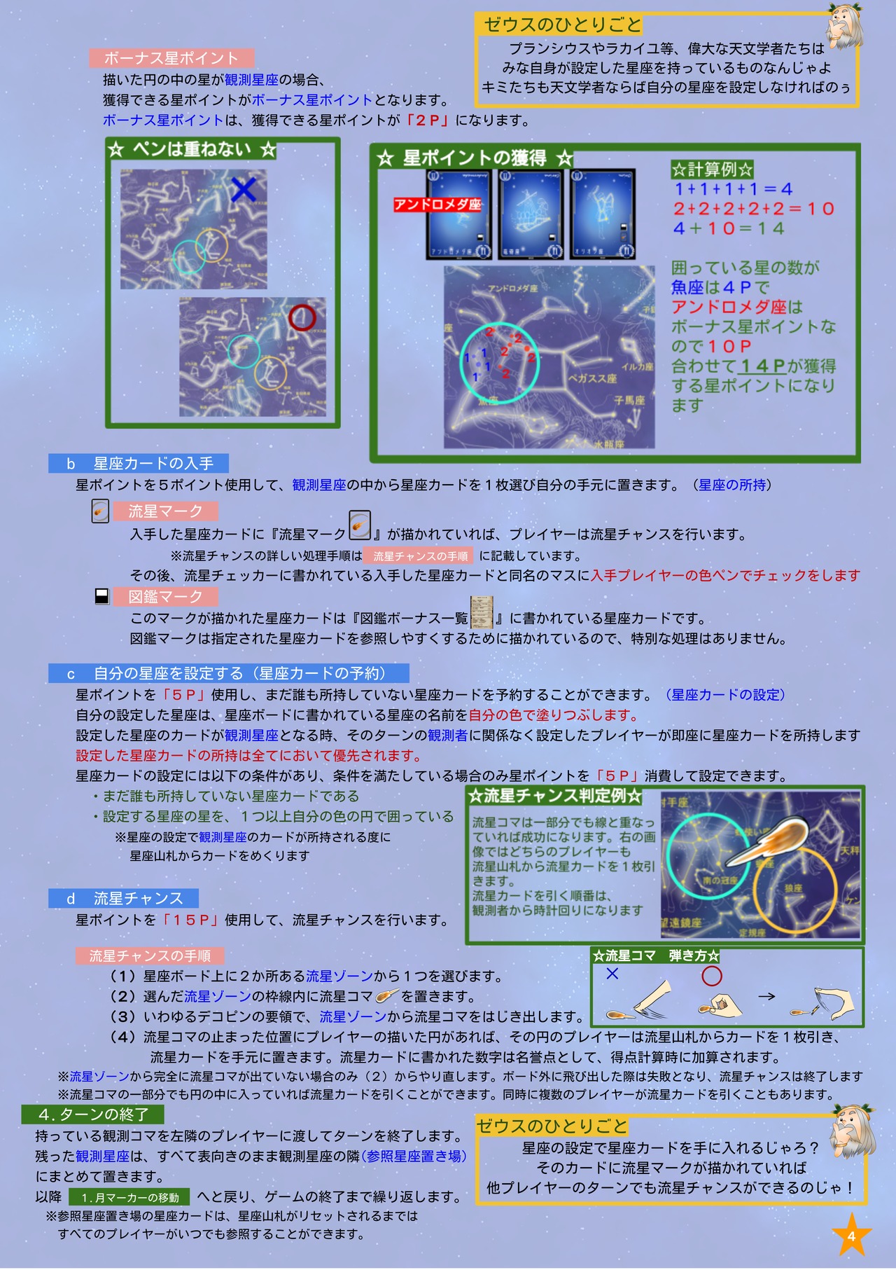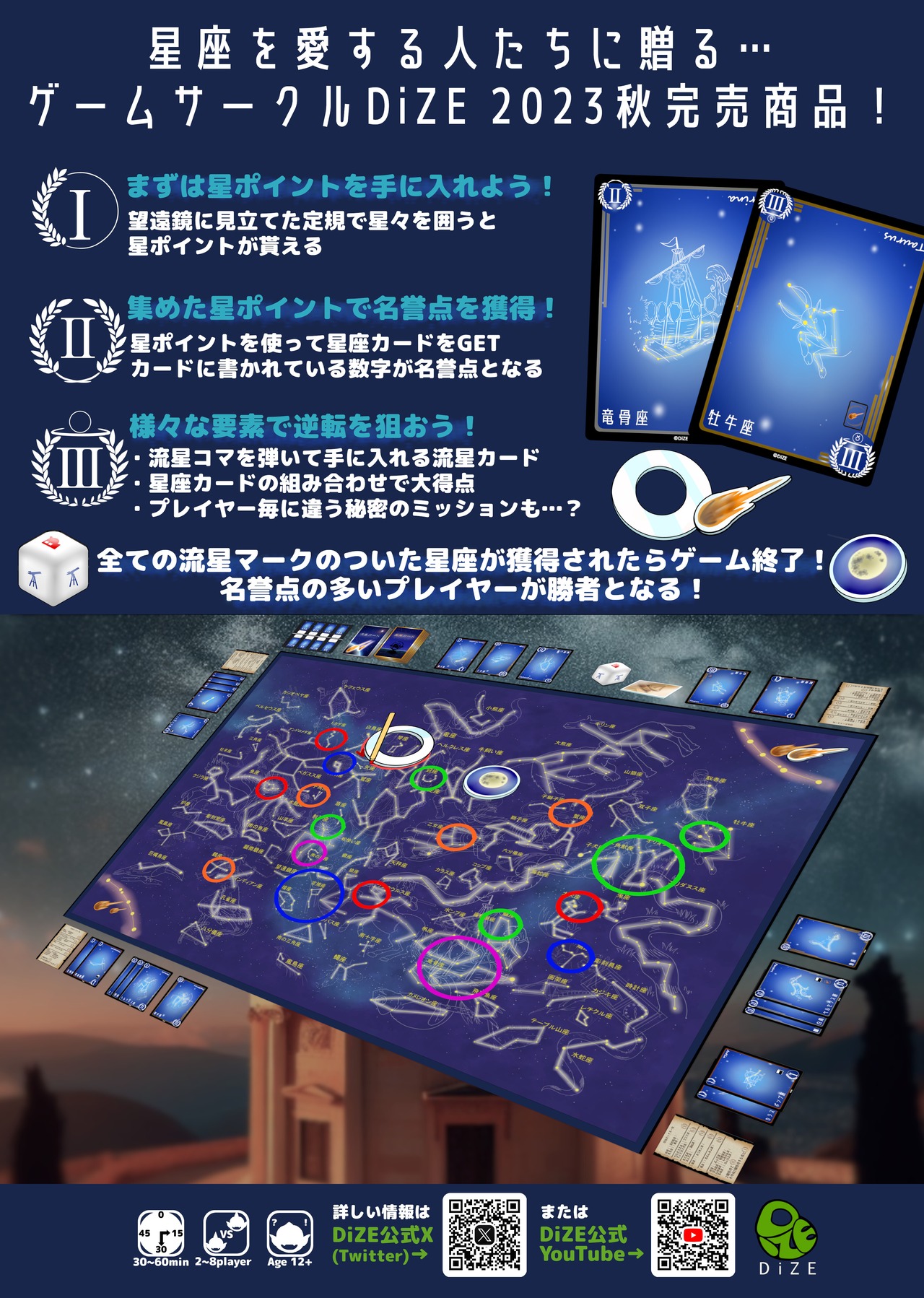 プレイヤーはマーカーペンで星を囲み、星ポイントを獲得します。流星チャンスや星座の組み合わせを上手に活用して、名誉点を大量にゲットすることが勝利への鍵です。プレイヤー達への秘密のミッションも・・・